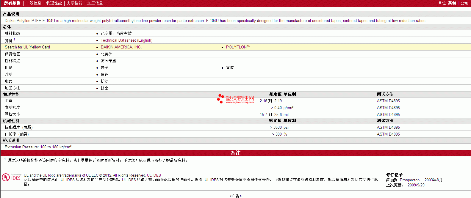 更多POLYFLON PTFE F-104U 物性表报价,图片、材质证明、UL黄卡、物质安全资料表(MSDS)等可来电咨询赵先生:13424755533或QQ: 27660005