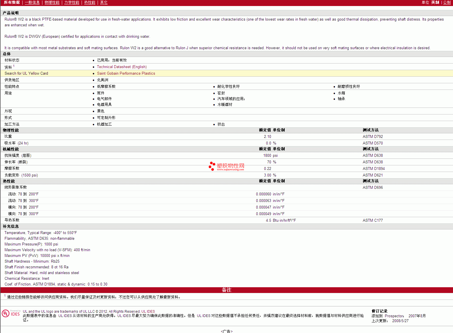需了解Rulon PTFE W2 物性表更多详情,材质证明、ROHS(SGS)报告、物质安全资料表(MSDS)、UL黄卡等,最新行情报价等可来电咨询:赵先生:13424755533或QQ: 27660005