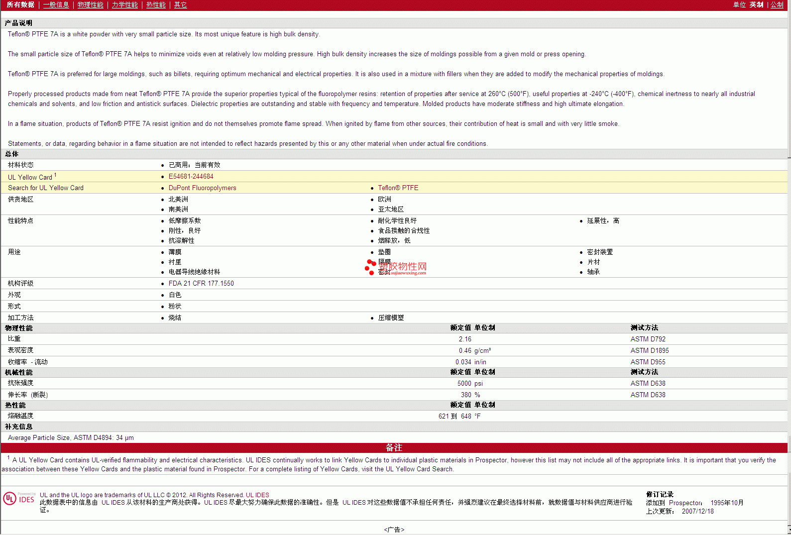 更多Teflon PTFE 7A 物性表报价,图片、材质证明、UL黄卡、物质安全资料表(MSDS)等,最新行情报价等可来电咨询赵先生:13424755533或QQ: 27660005