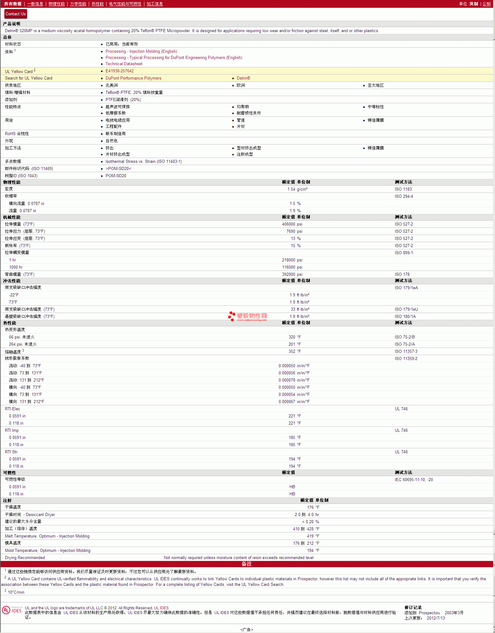 需了解Delrin PTFE 520MP NC010 物性表更多详情,材质证明、ROHS(SGS)报告、物质安全资料表(MSDS)、UL黄卡等,最新行情报价等可来电咨询:赵先生:13424755533或QQ: 27660005