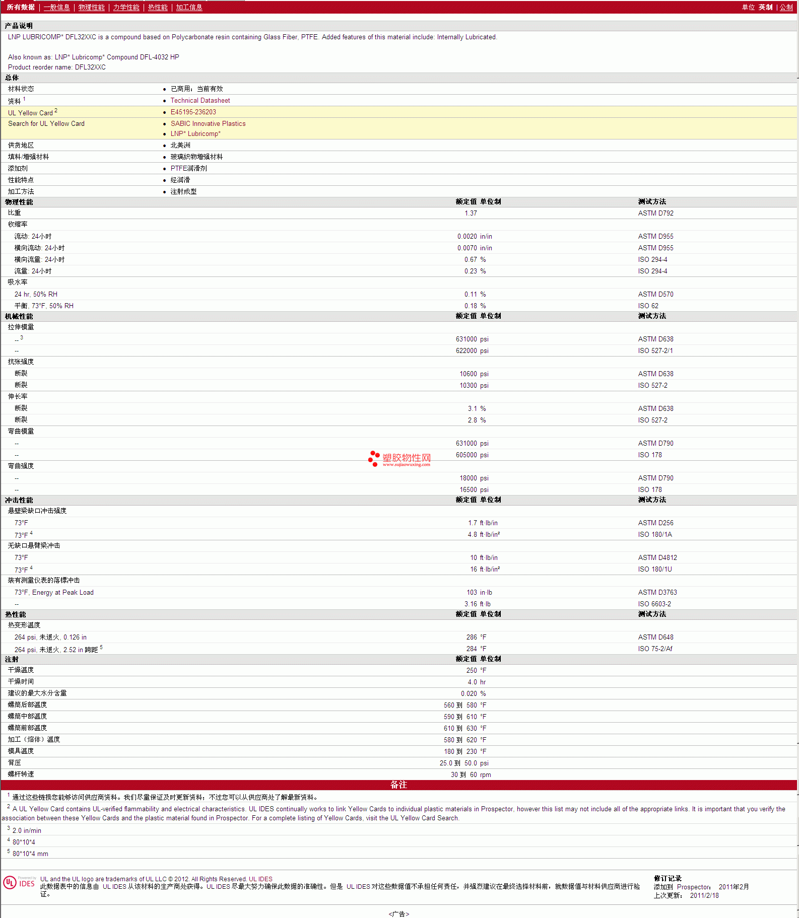 更多 LNP Lubricomp PTFE DFL32XXC 物性表报价,图片、材质证明、UL黄卡、物质安全资料表(MSDS)等可来电咨询赵先生:13424755533或QQ: 27660005
