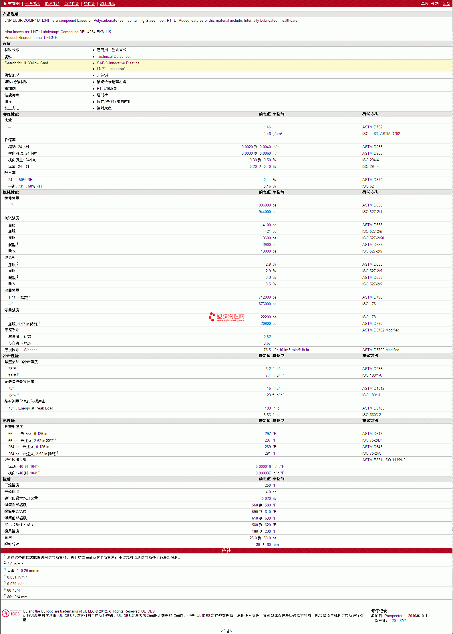 如需了解LNP Lubricomp PTFE DFL34H 物性表更多详情,ROHS(SGS)报告、物质安全资料表(MSDS)、材质证明、UL黄卡等,最新行情报价等可来电咨询:赵先生:13424755533或QQ: 27660005