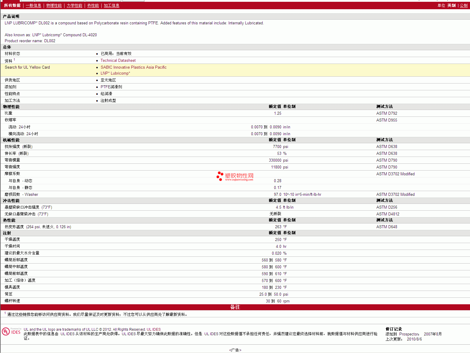 更多LNP Lubricomp PTFE DL002 物性表报价,图片、材质证明、UL黄卡、物质安全资料表(MSDS)等,最新行情报价等可来电咨询赵先生:13424755533或QQ: 27660005