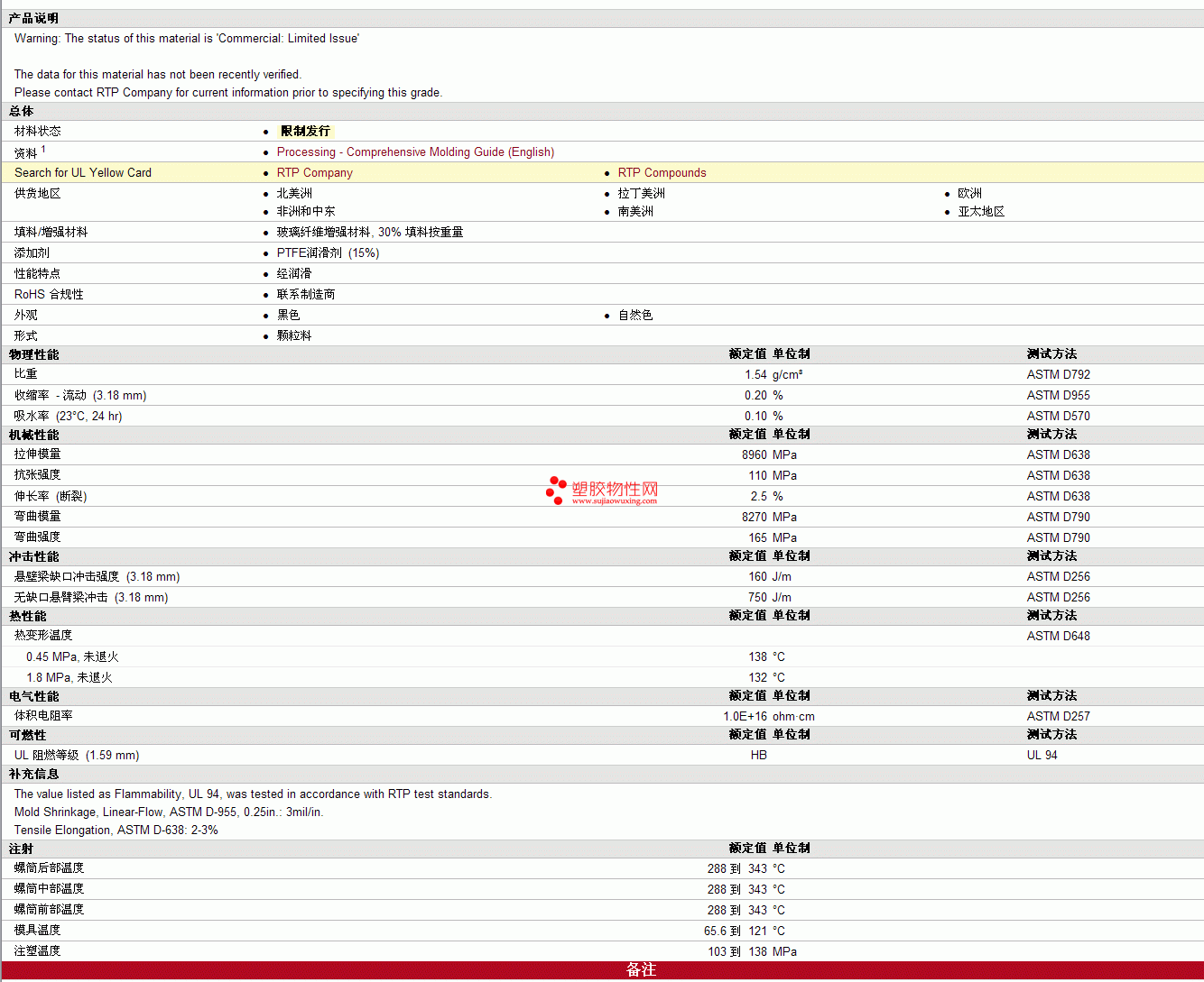 RTP Compounds pc 305 TFE 15 LF物性表 见图片
