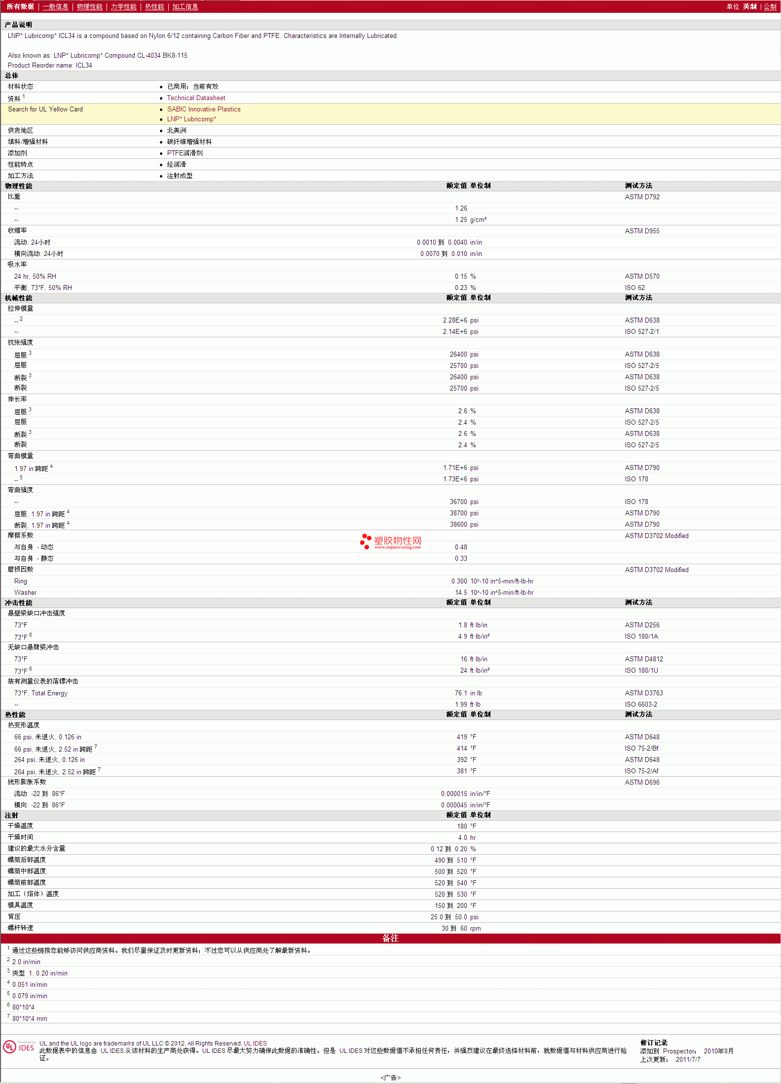 需了解LNP Lubricomp PTFE ICL34 物性表材质证明、ROHS(SGS)报告、物质安全资料表(MSDS)、UL黄卡等可来电咨询:赵先生:13424755533或QQ: 27660005