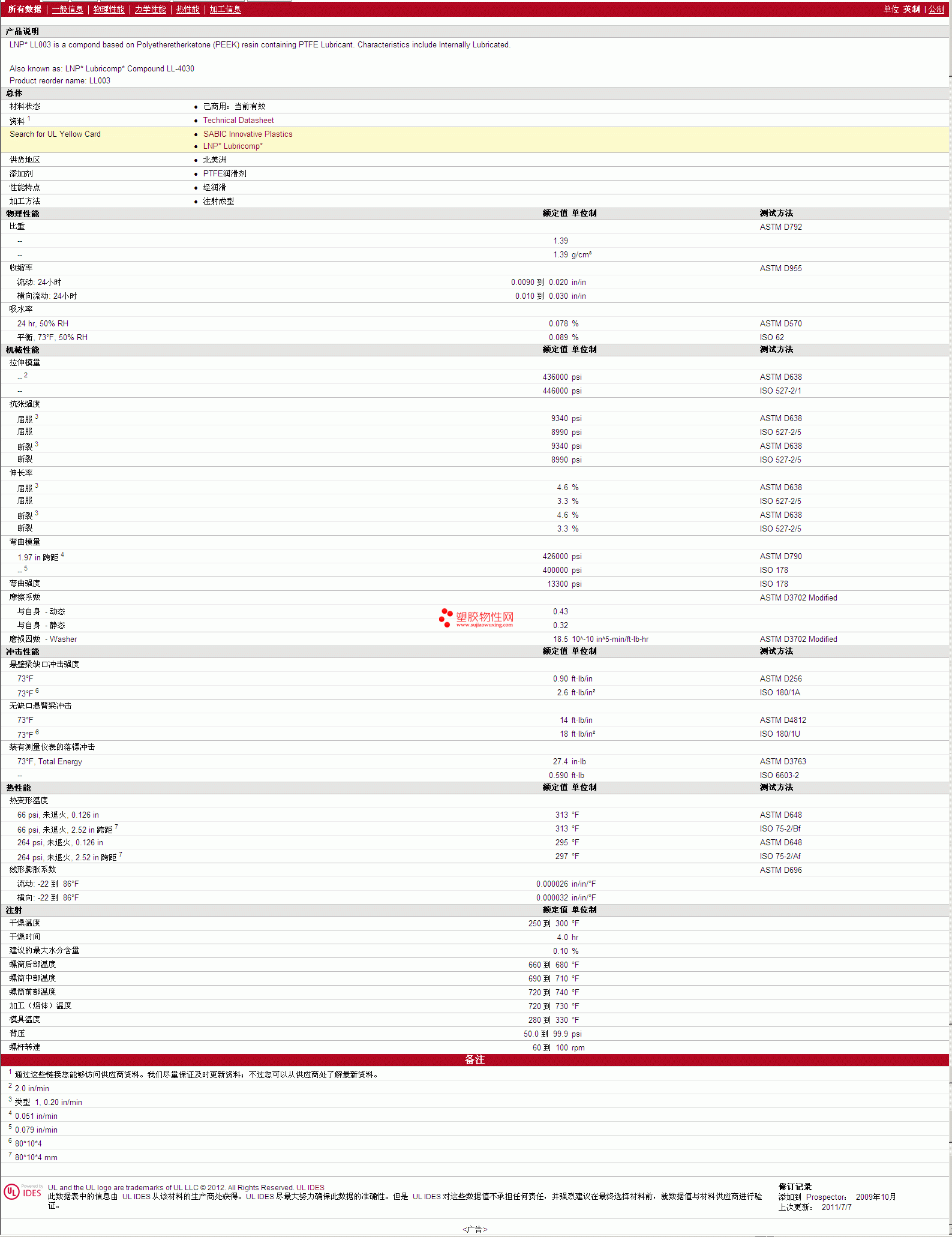 需了解LNP Lubricomp PTFE LL003 物性表材质证明、ROHS(SGS)报告、物质安全资料表(MSDS)、UL黄卡等可来电咨询:赵先生:13424755533或QQ: 27660005