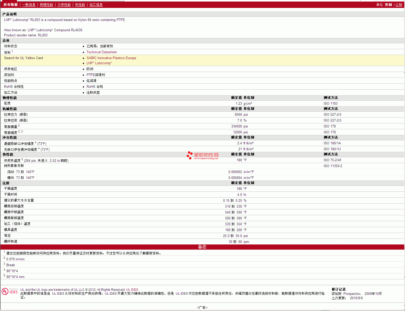 需了解LNP Lubricomp PTFE RL003 物性表更多详情,材质证明、ROHS(SGS)报告、物质安全资料表(MSDS)、UL黄卡等,最新行情报价等可来电咨询:赵先生:13424755533或QQ: 27660005
