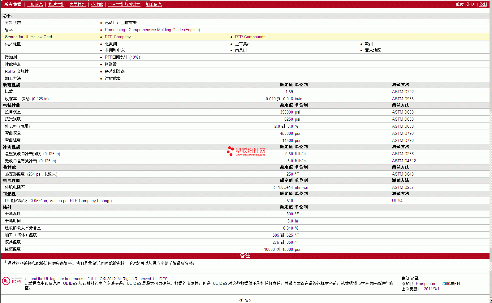 更多RTP Compounds PTFE 1300 TFE 40 物性表报价,图片、材质证明、UL黄卡、物质安全资料表(MSDS)等可来电咨询赵先生:13424755533或QQ: 27660005