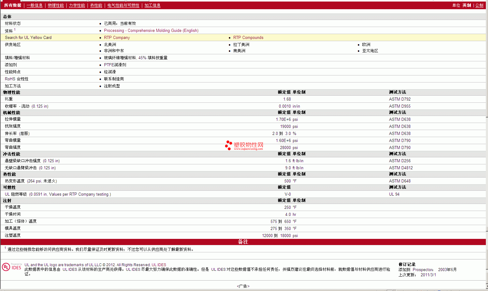 如需了解RTP Compounds PTFE 1378 C 物性表更多详情,ROHS(SGS)报告、物质安全资料表(MSDS)、材质证明、UL黄卡等,最新行情报价等可来电咨询:赵先生:13424755533或QQ: 27660005