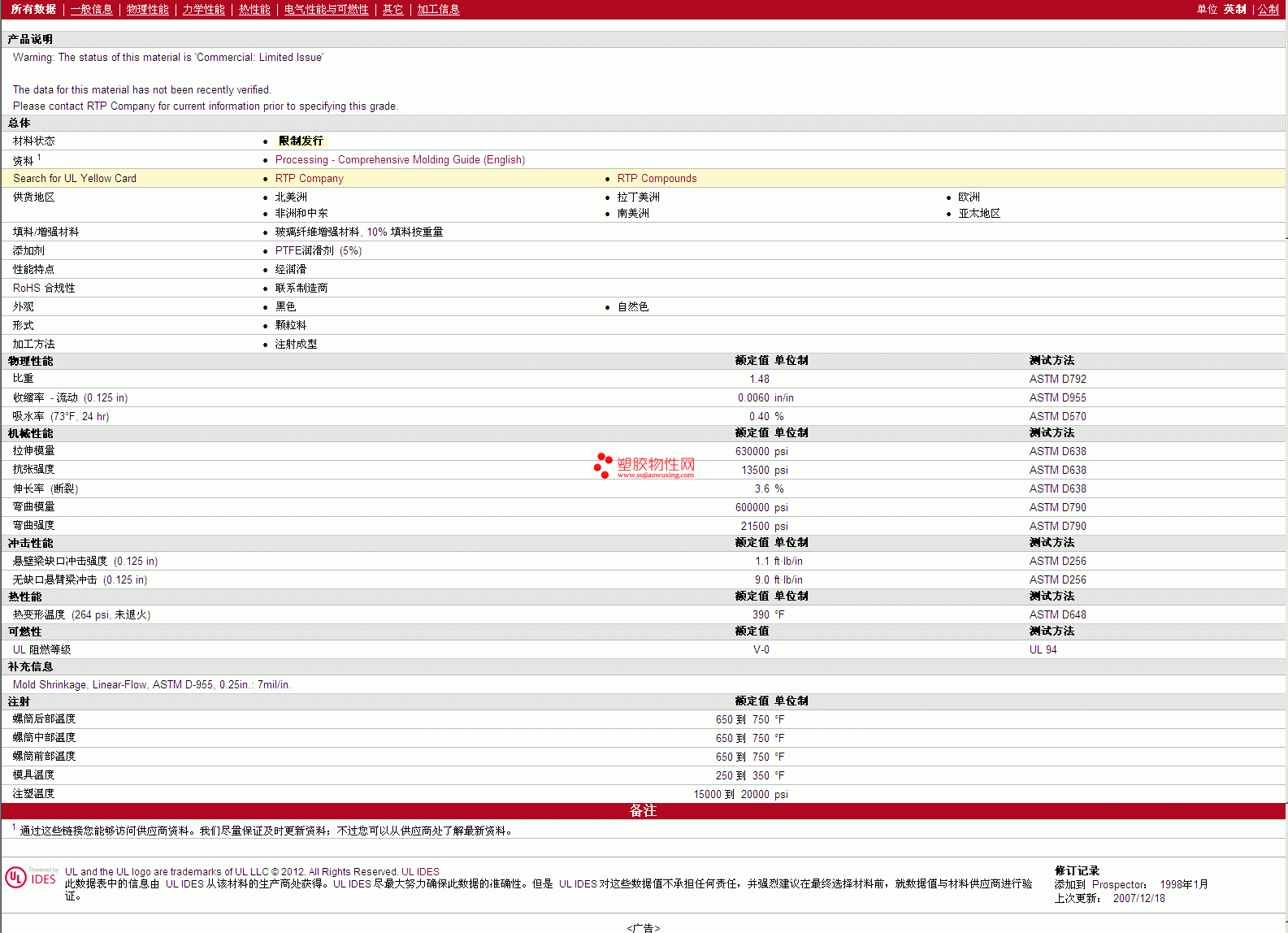 更多RTP Compounds PTFE 1601 TFE 5 物性表报价,图片、材质证明、UL黄卡、物质安全资料表(MSDS)等,最新行情报价等可来电咨询赵先生:13424755533或QQ: 27660005