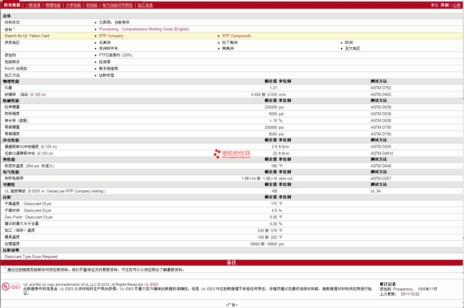 如需了解 RTP Compounds PTFE 200 H TFE 20 物性表更多详情,ROHS(SGS)报告、物质安全资料表(MSDS)、材质证明、UL黄卡等,最新行情报价等可来电咨询:赵先生:13424755533或QQ: 27660005