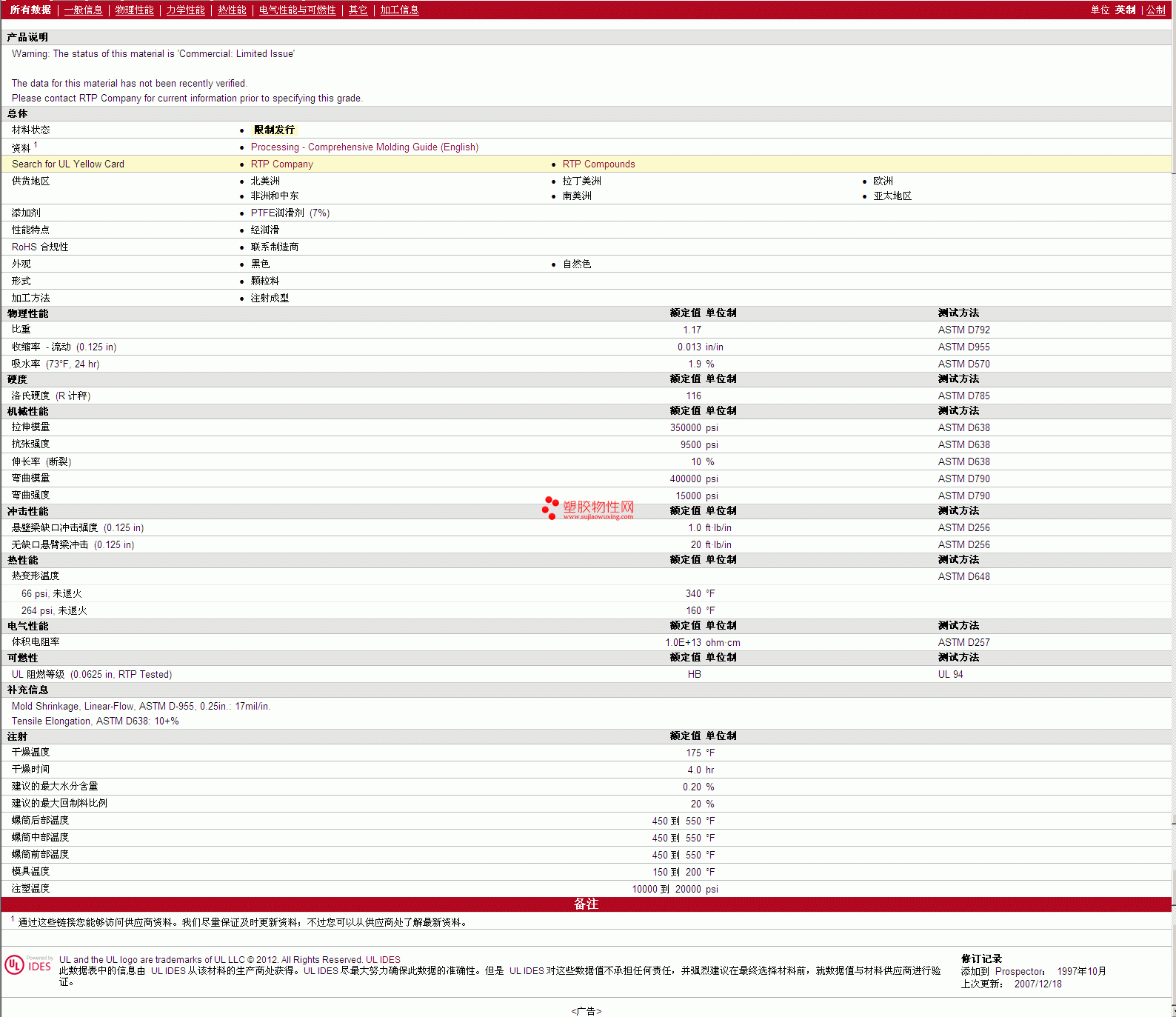 更多 RTP Compounds PTFE 200A TFE 7 物性表报价,图片、材质证明、UL黄卡、物质安全资料表(MSDS)等可来电咨询赵先生:13424755533或QQ: 27660005