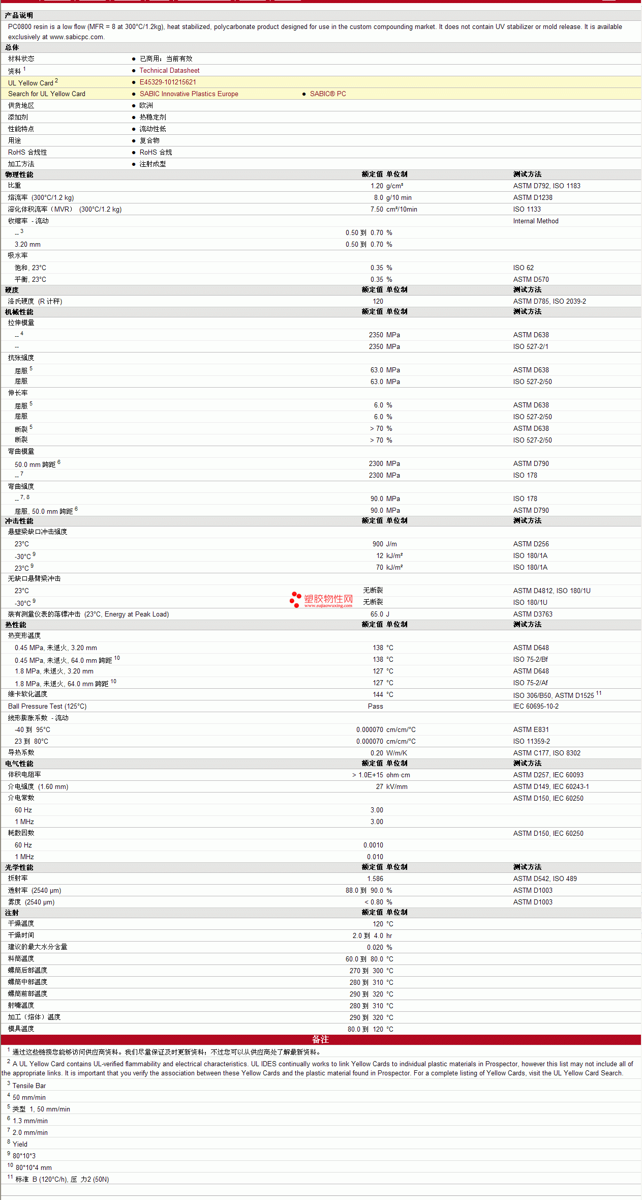 SABIC pc PC PC0800 Resin物性表 见图片