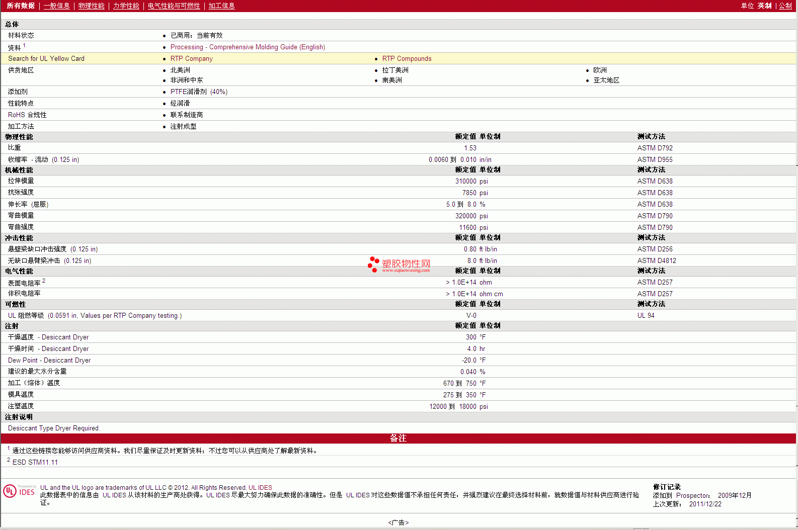 如需了解 RTP Compounds PTFE 2100 TFE 40 物性表更多详情,ROHS(SGS)报告、物质安全资料表(MSDS)、材质证明、UL黄卡等,最新行情报价等可来电咨询:赵先生:13424755533或QQ: 27660005