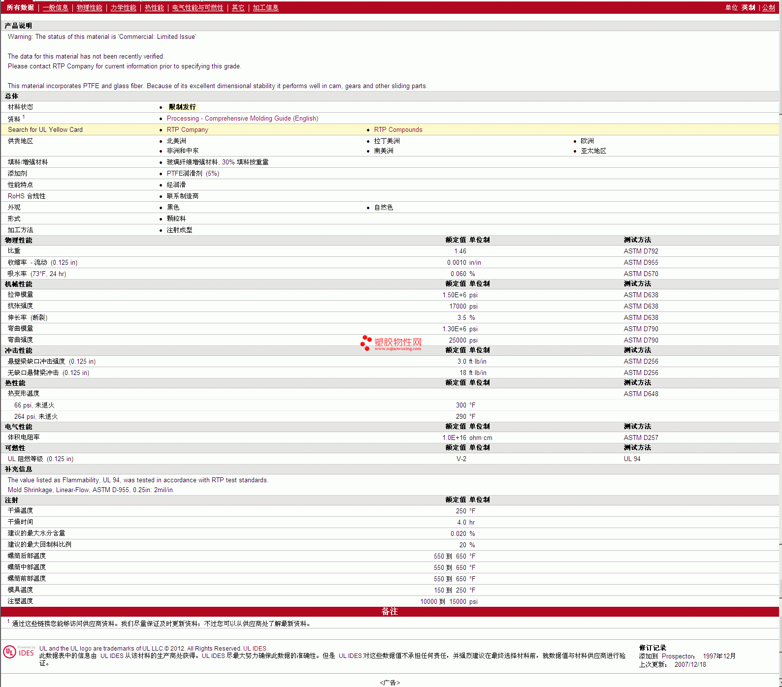更多RTP Compounds PTFE 305 TFE 5 物性表报价,图片、材质证明、UL黄卡、物质安全资料表(MSDS)等,最新行情报价等可来电咨询赵先生:13424755533或QQ: 27660005