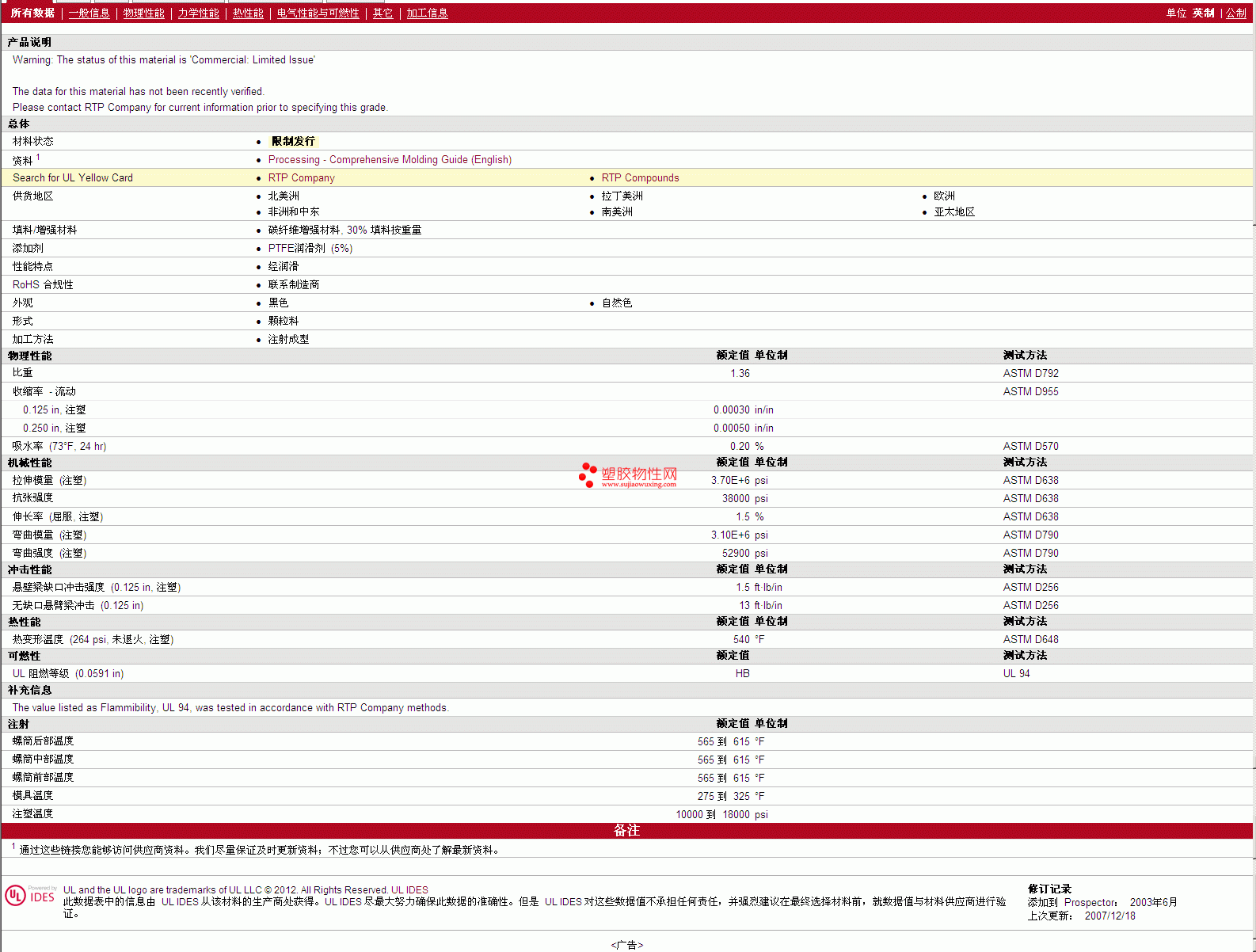 更多RTP Compounds PTFE 4085 TFE 5 物性表报价,图片、材质证明、UL黄卡、物质安全资料表(MSDS)等可来电咨询赵先生:13424755533或QQ: 27660005