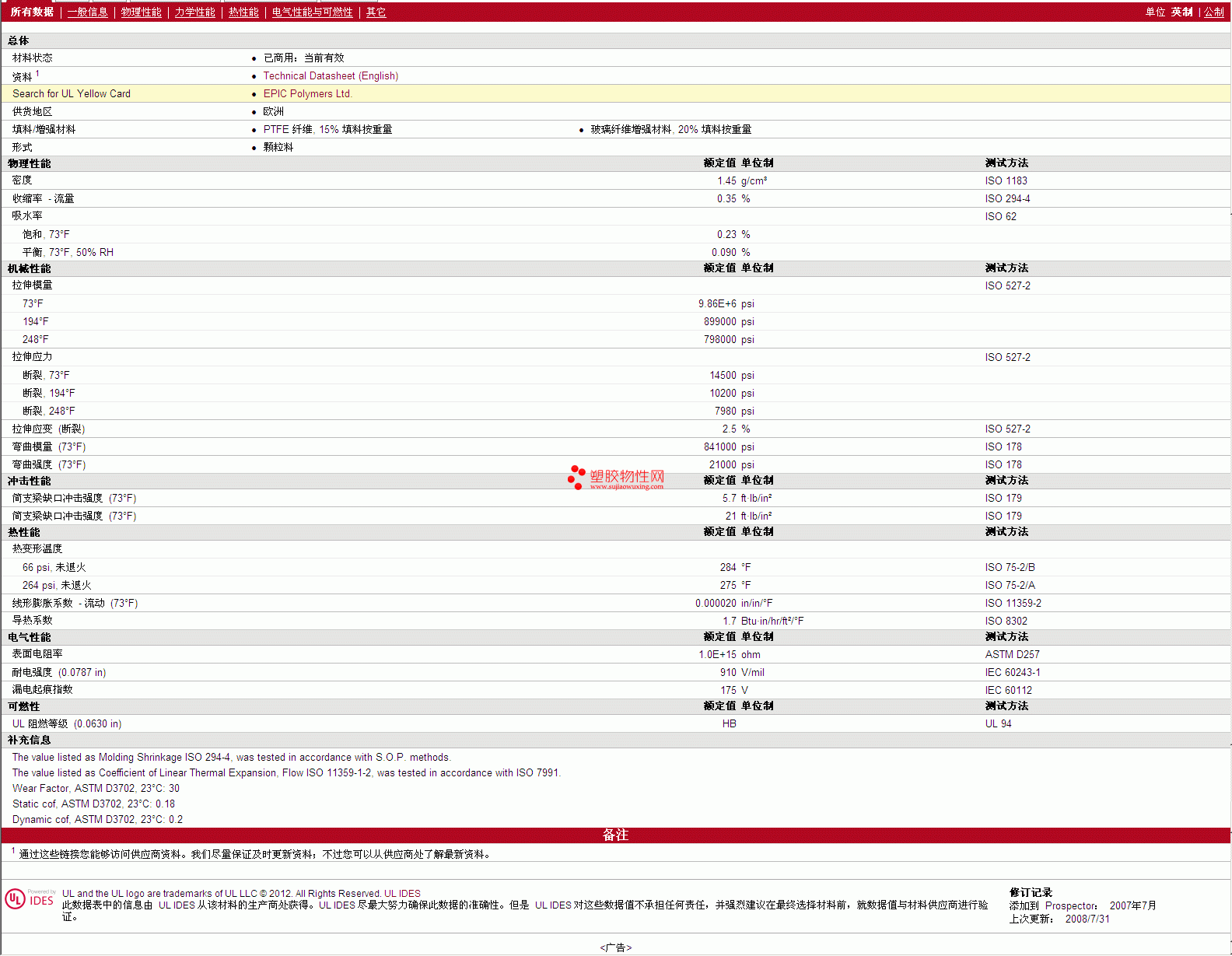 更多TRIBOCOMP PTFE PC GF20 TS0 物性表图片,报价、物质安全资料表(MSDS)、材质证明、UL黄卡等,最新行情报价等可来电咨询赵先生:13424755533或QQ: 27660005