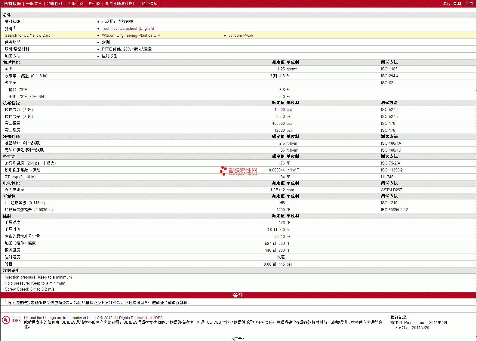 需了解Witcom PTFE PA66 4L1 物性表材质证明、ROHS(SGS)报告、物质安全资料表(MSDS)、UL黄卡等可来电咨询:赵先生:13424755533或QQ: 27660005