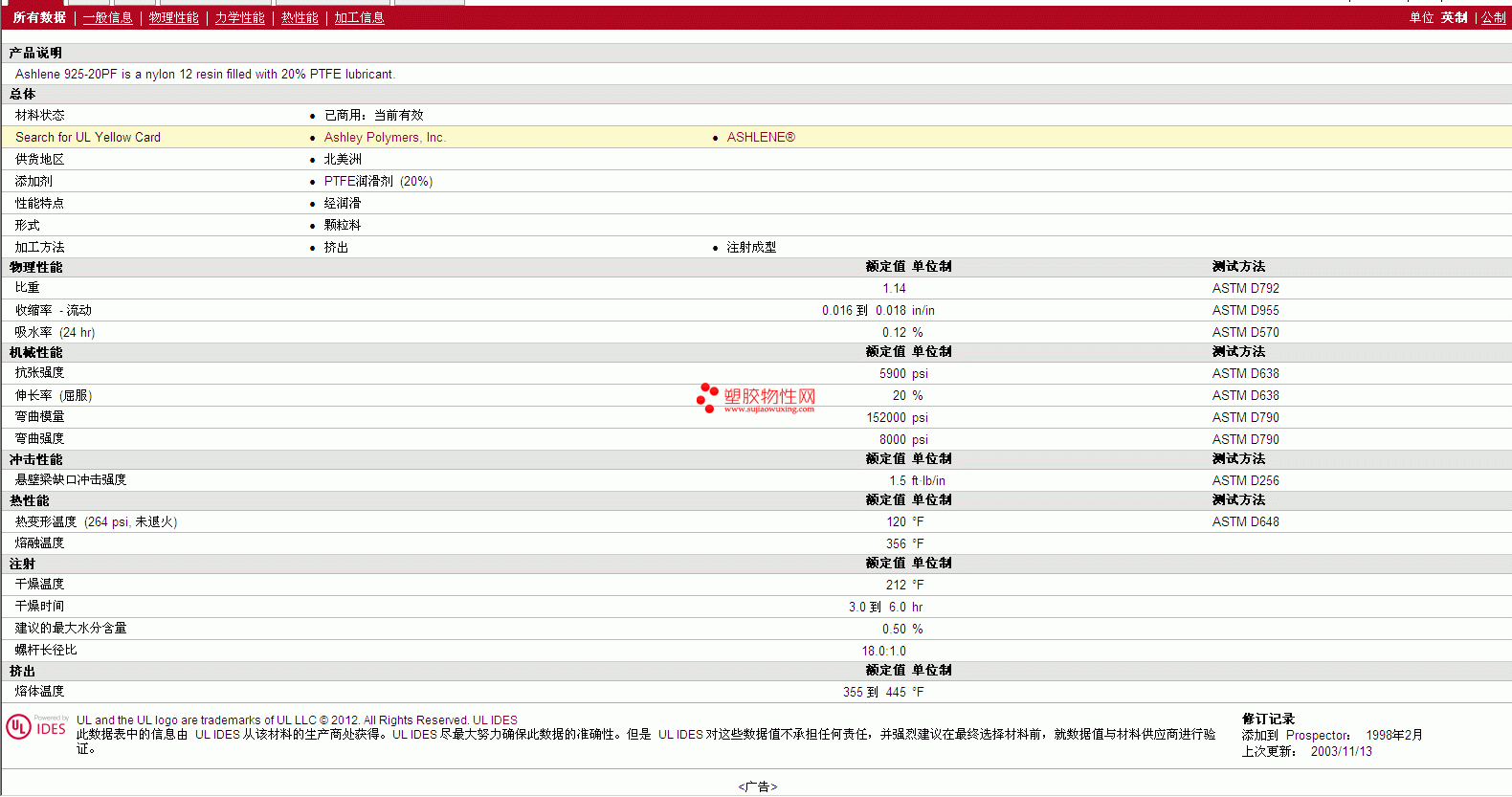 更多ASHLENE PTFE 925-20PF 物性表报价,图片、材质证明、UL黄卡、物质安全资料表(MSDS)等,最新行情报价等可来电咨询赵先生:13424755533或QQ: 27660005