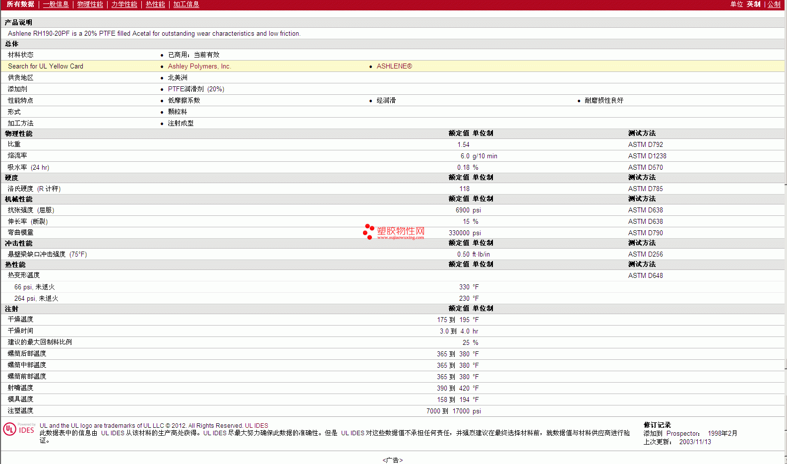 如需了解ASHLENE PTFE RH190-20PF 物性表更多详情,ROHS(SGS)报告、物质安全资料表(MSDS)、材质证明、UL黄卡等,最新行情报价等可来电咨询:赵先生:13424755533或QQ: 27660005