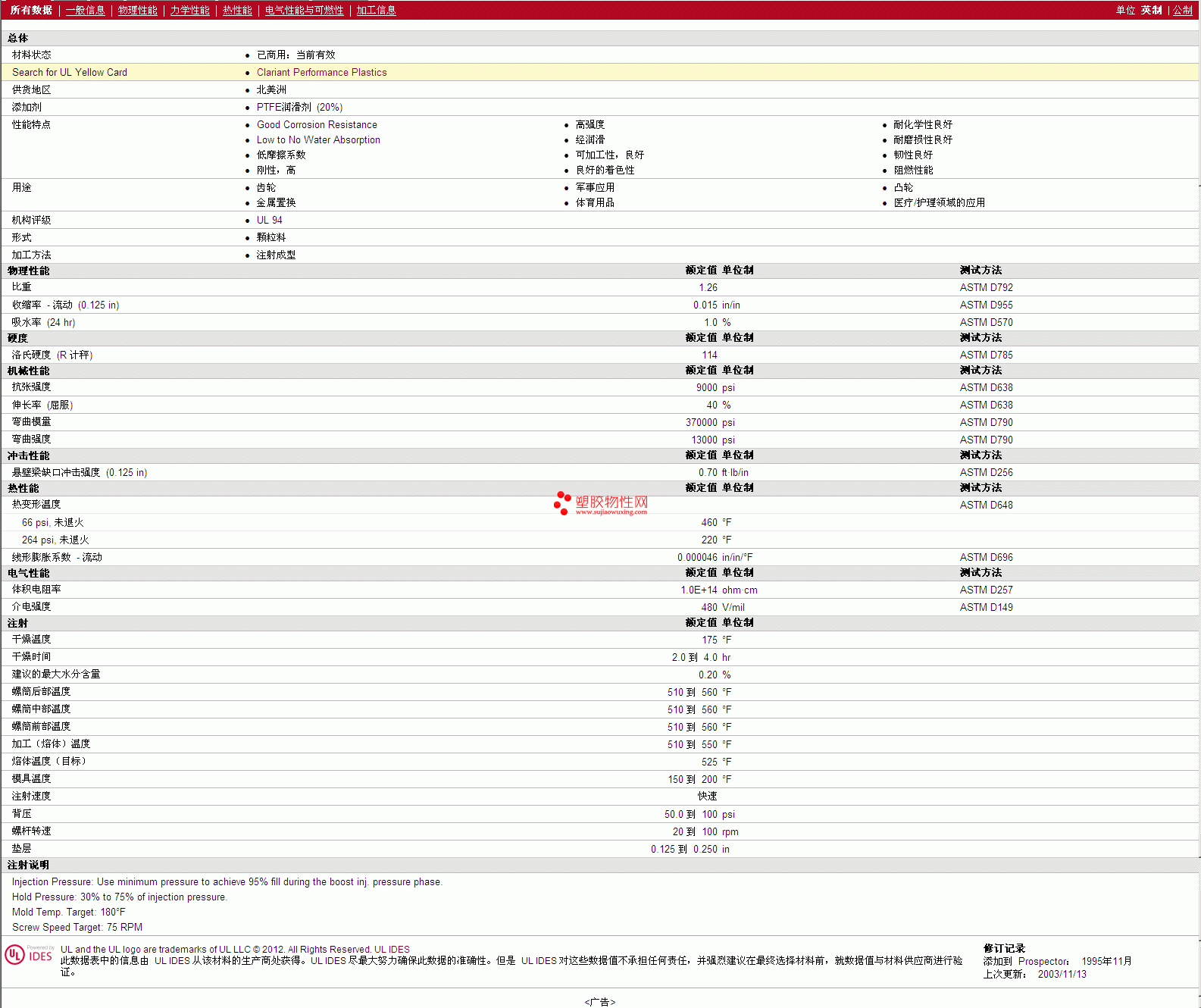 Clariant Nylon PTFE 6/6 PA-111TF20 物性表