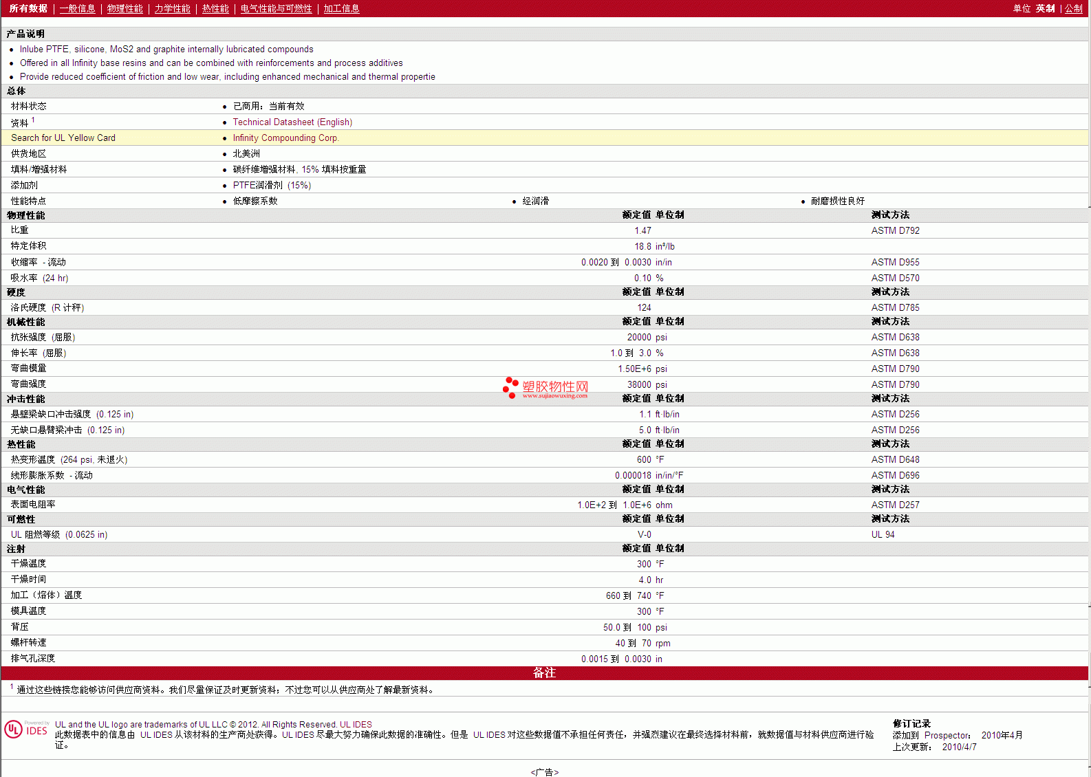如需了解INLUBE PTFE PEEKCF15TF15 物性表更多详情,ROHS(SGS)报告、物质安全资料表(MSDS)、材质证明、UL黄卡等,最新行情报价等可来电咨询:赵先生:13424755533或QQ: 27660005